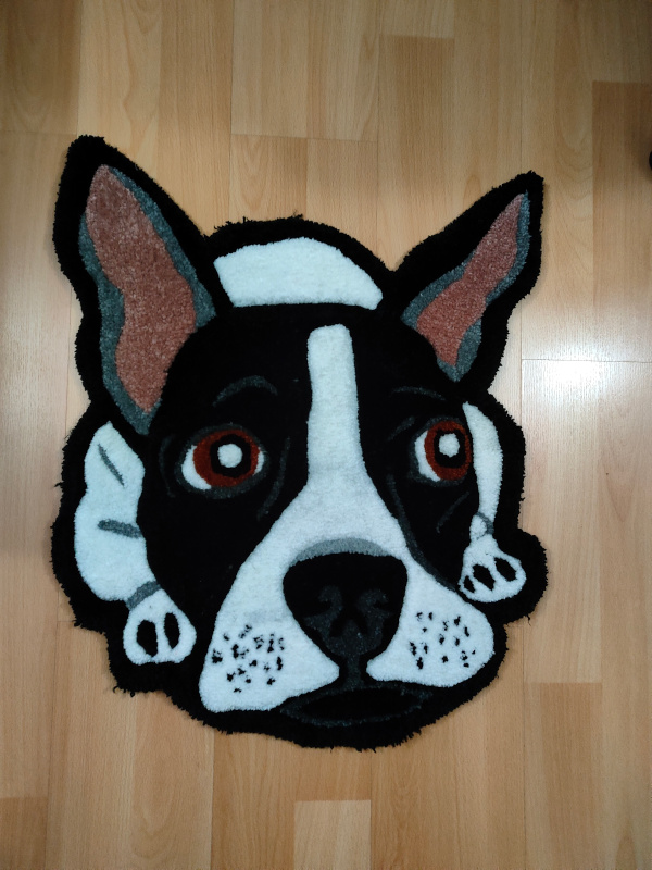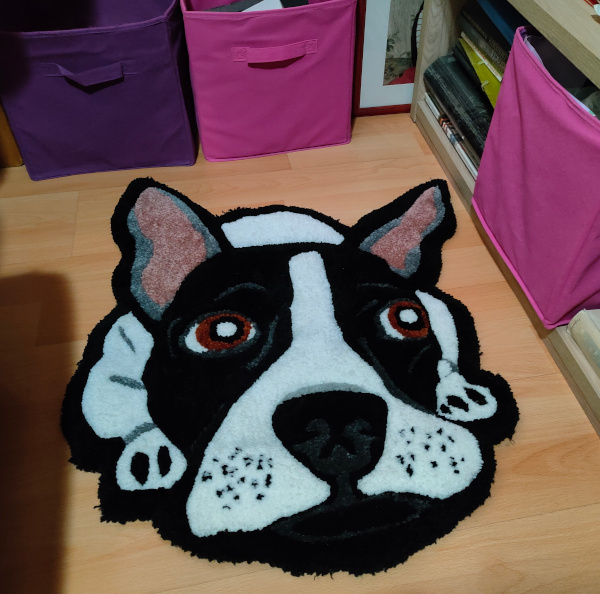 Alfombra hecha con tufting de Dora una adorable perrita que se presto a ser nuestra modelo. Su comodidad la hace irresistible al igual que su tierna mirada.